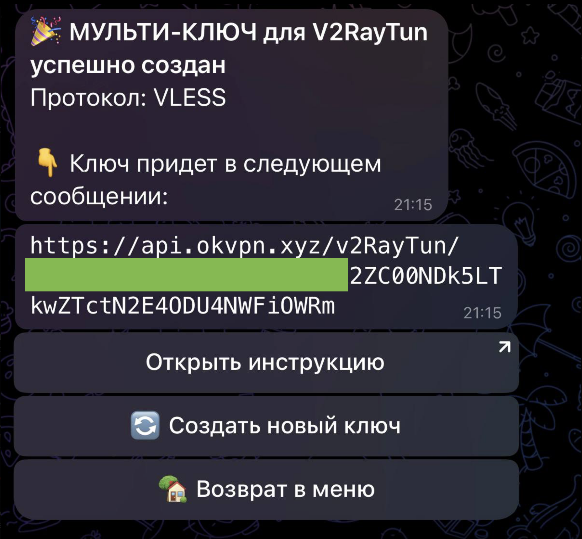 Вам нужен ключ, который выглядит как большая строка со случайными символами и начинается с https://. Ключ приходит после оплаты, но его всегда можно заново получить, если есть активная подписка на КЧАУ VPN