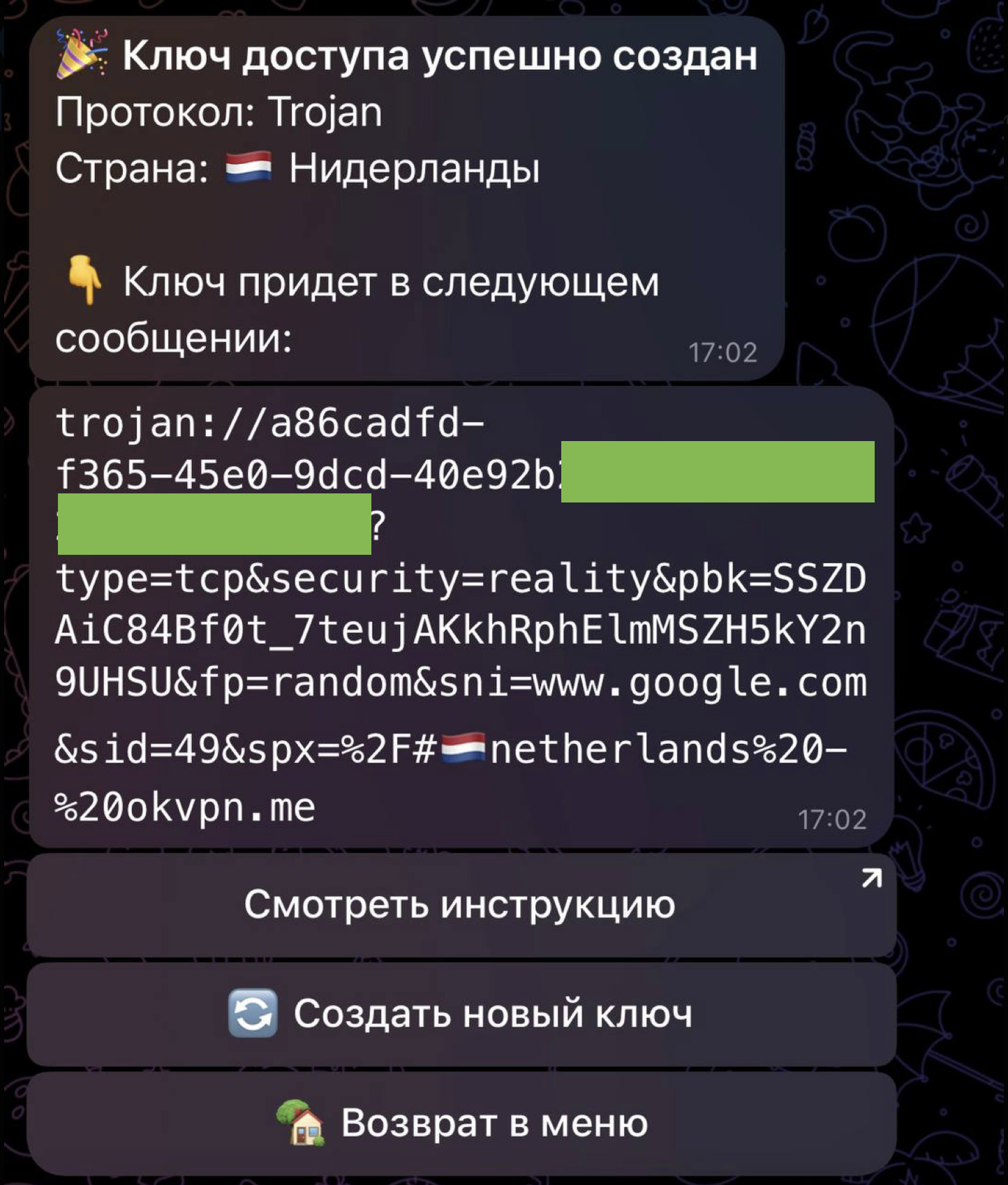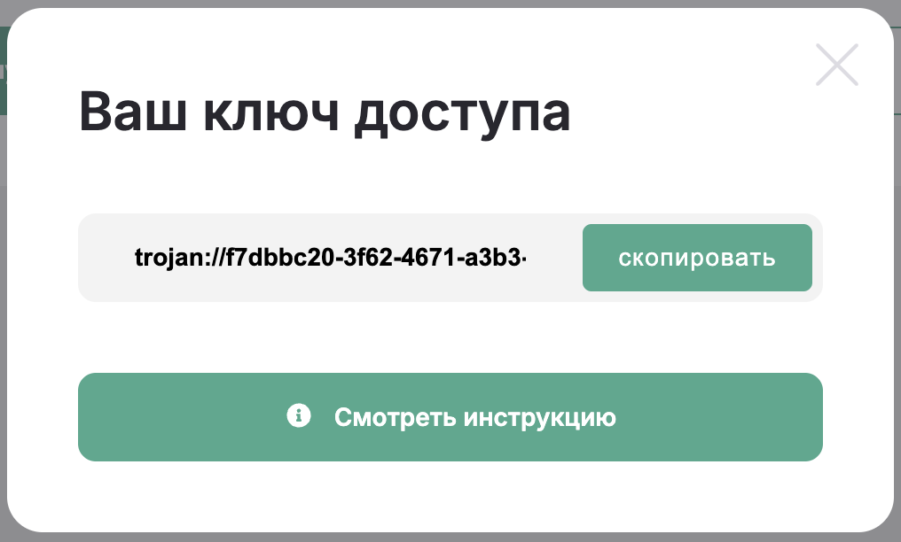 Вам нужен ключ, который выглядит как большая строка со случайными символами и начинается с trojan://. Ключ приходит после оплаты, но его всегда можно заново получить, если есть активная подписка на КЧАУ VPN