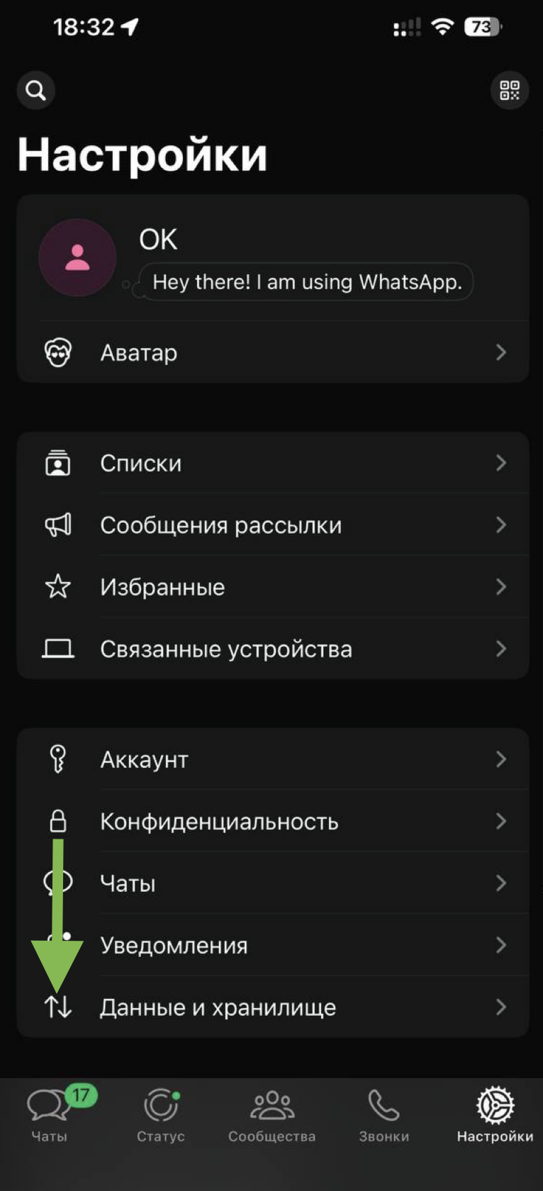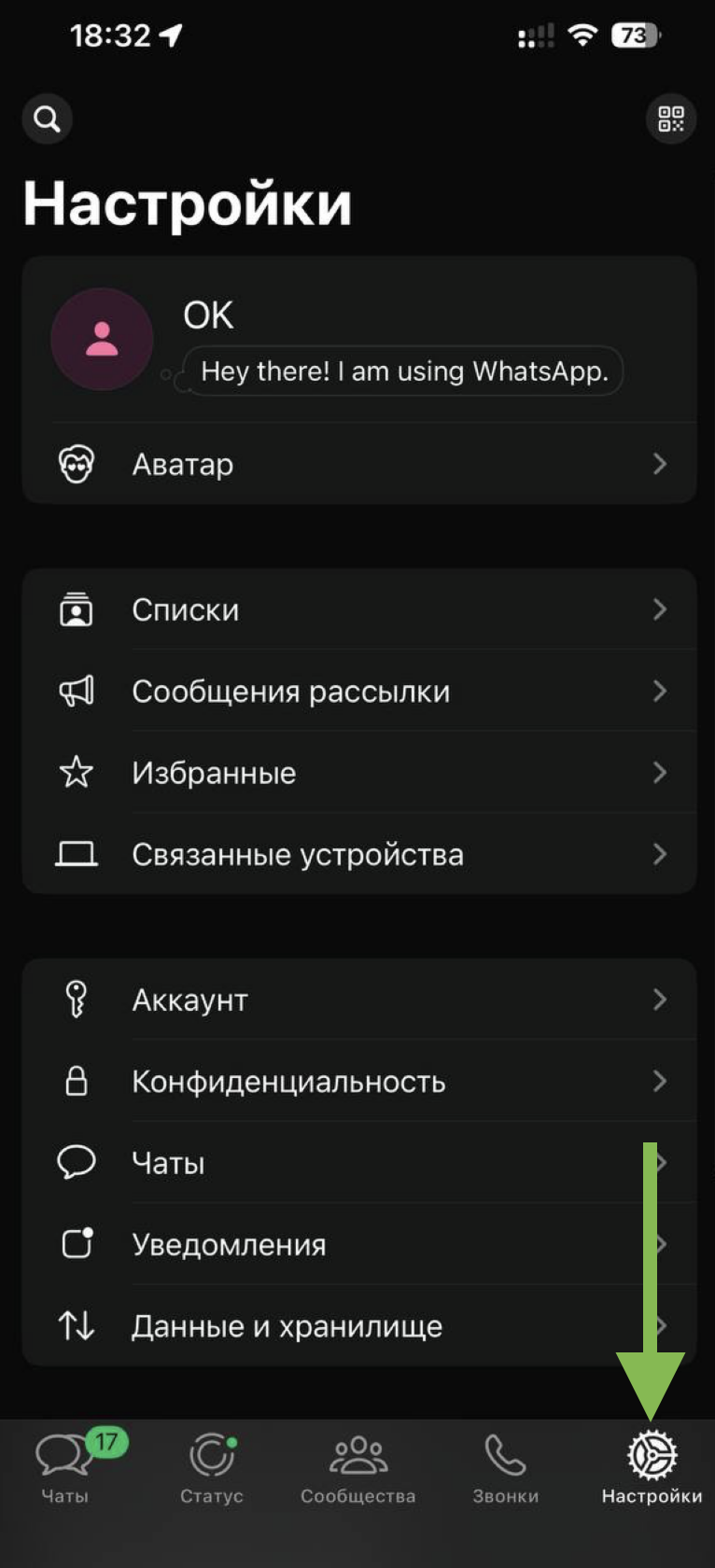 Откройте приложение WhatsApp и перейдите в раздел «Настройки»
