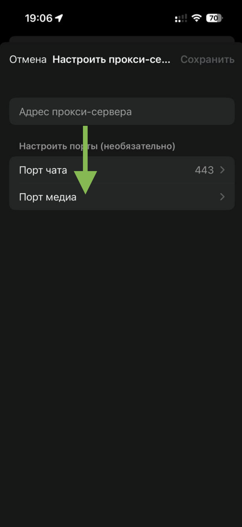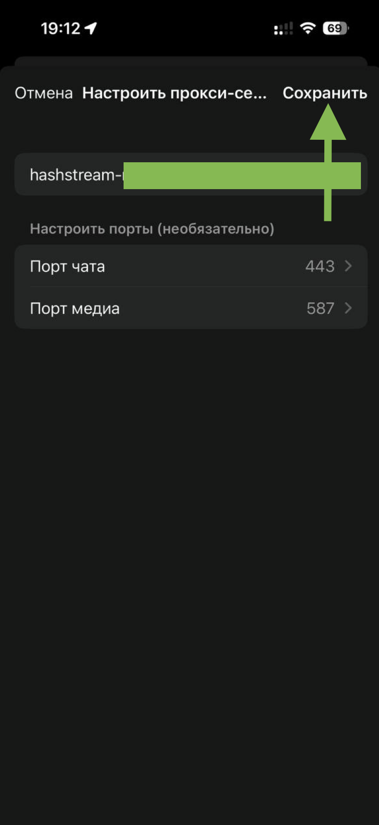 В поле «Адрес прокси-сервера» вставьте ранее скопированный ключ, который вы получили в телеграмм-боте или на сайте. Нажмите на кнопку «Сохранить»